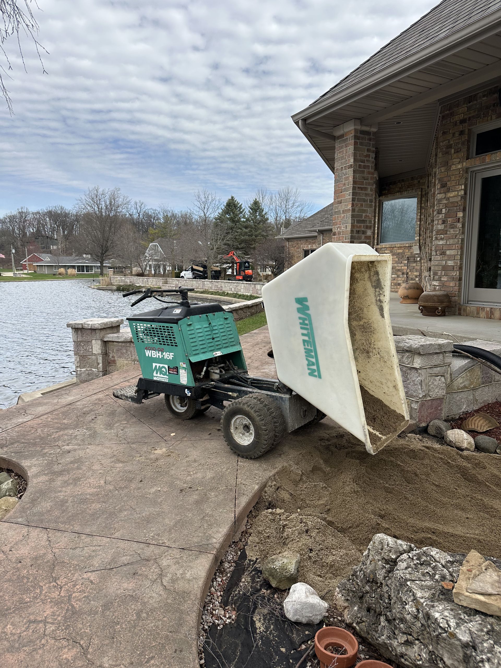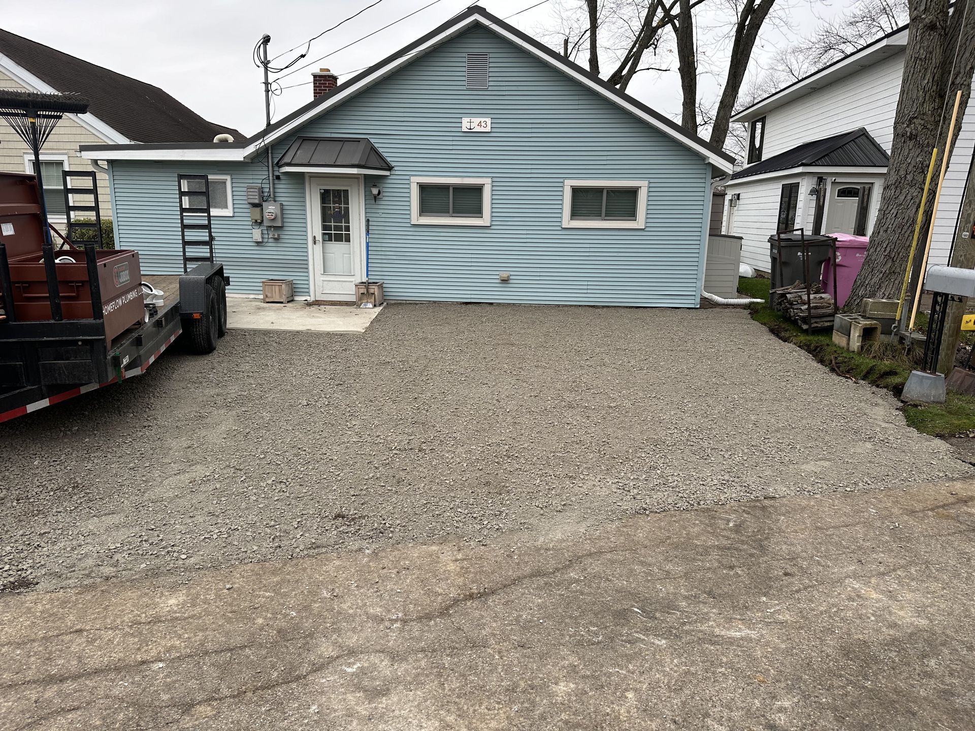 A septic tank is being installed in the backyard of a house.