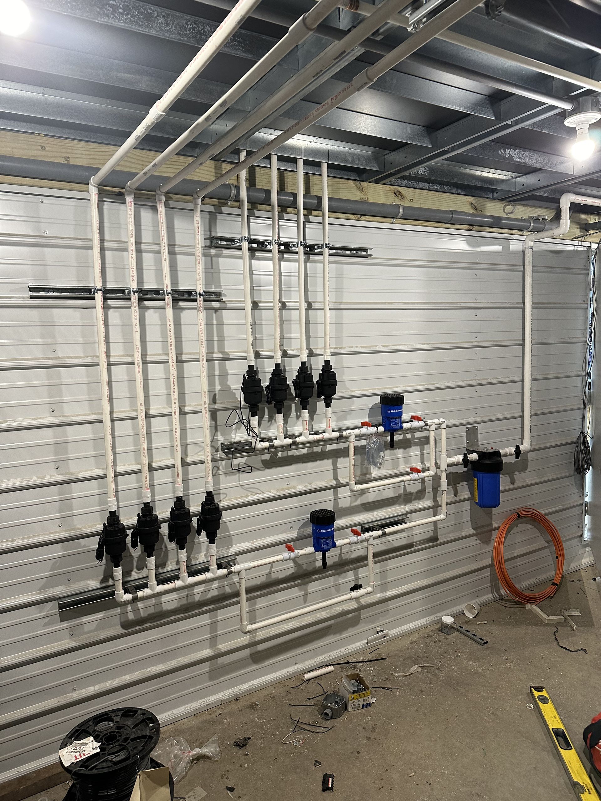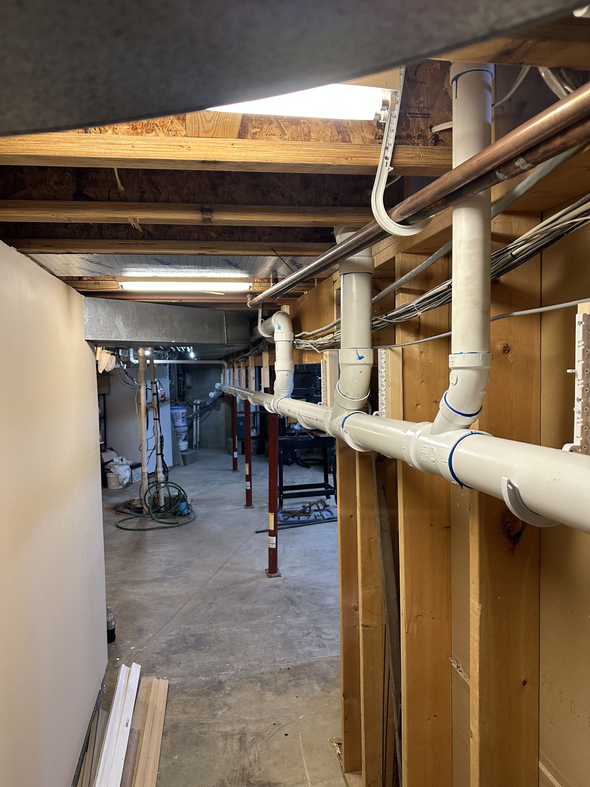 A room in a house under construction with a lot of pipes coming out of the ceiling.