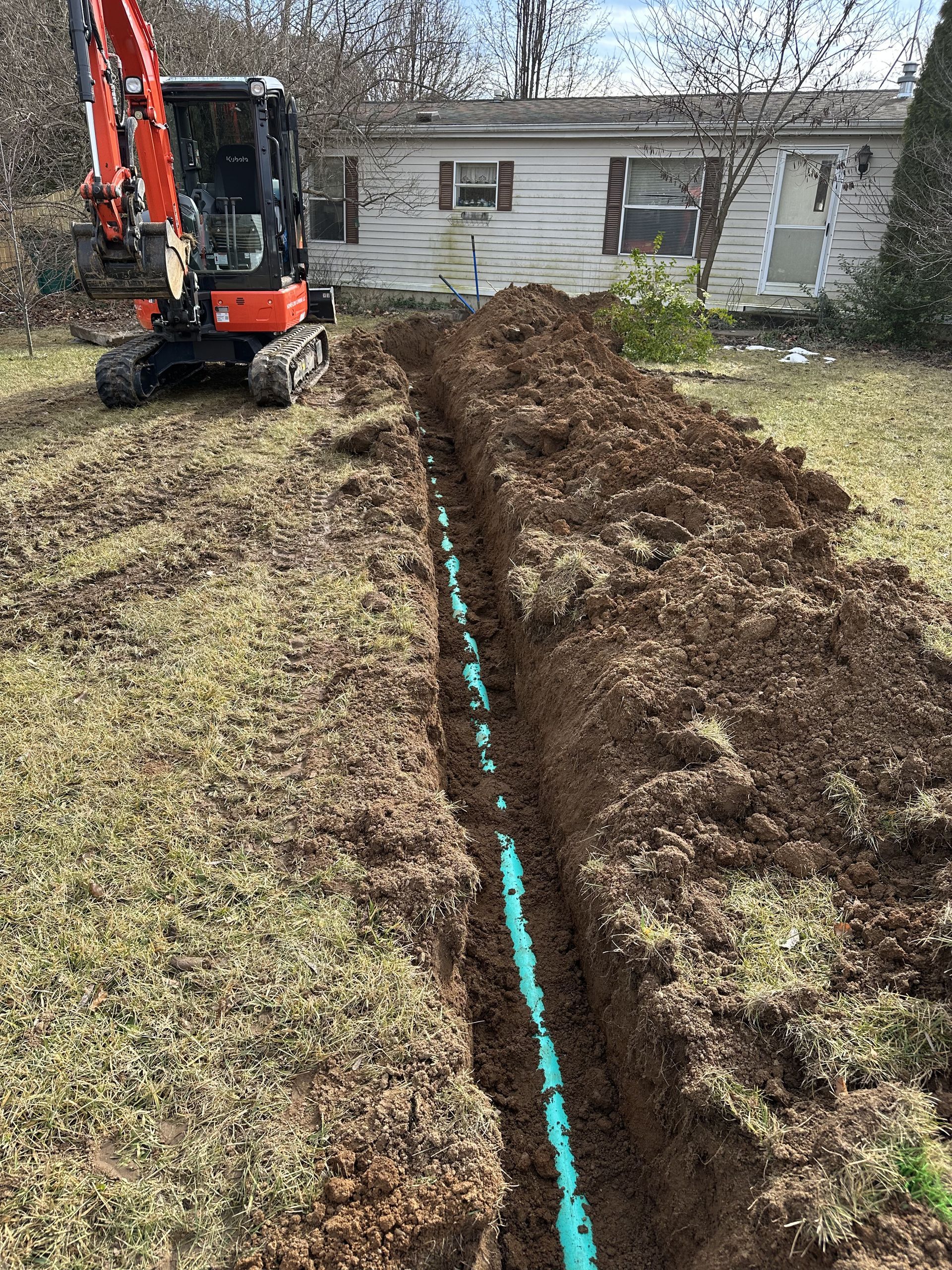 A small excavator is digging a trench in a yard.