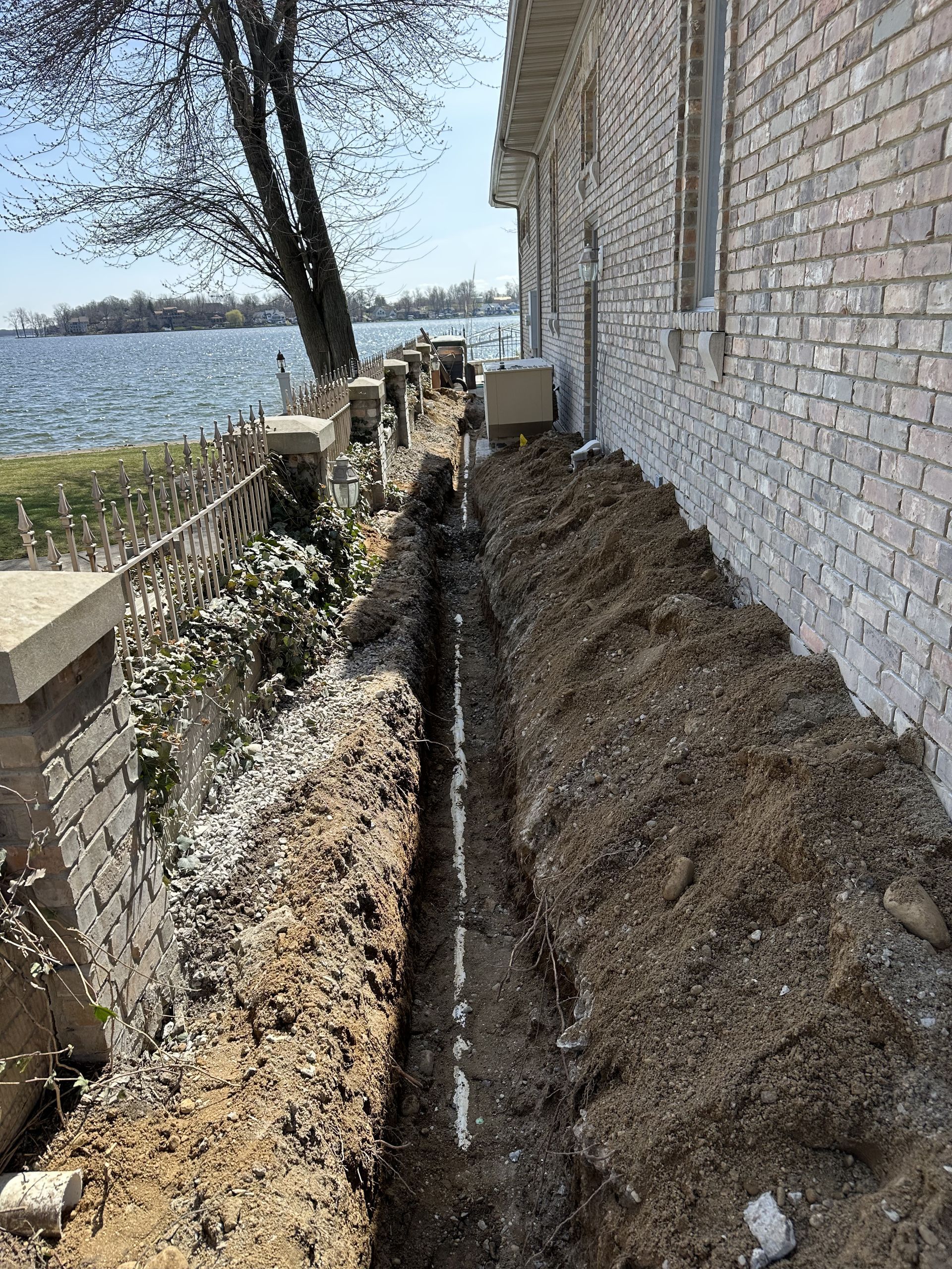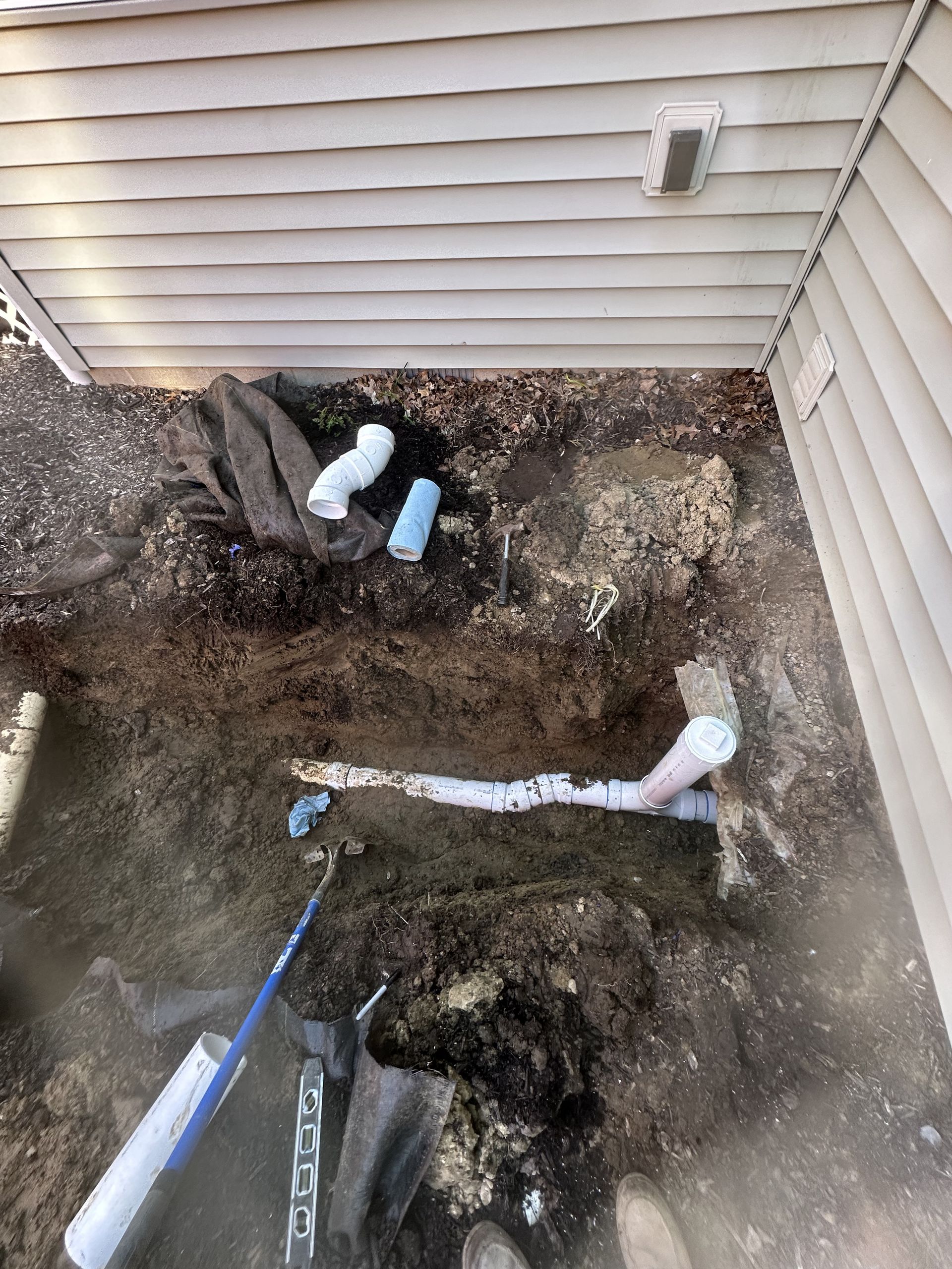 A drain pipe is being installed in the dirt next to a house.